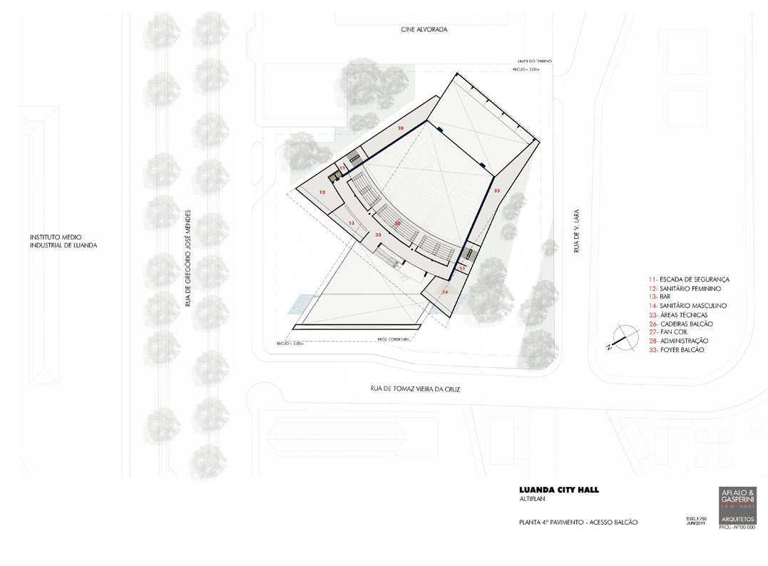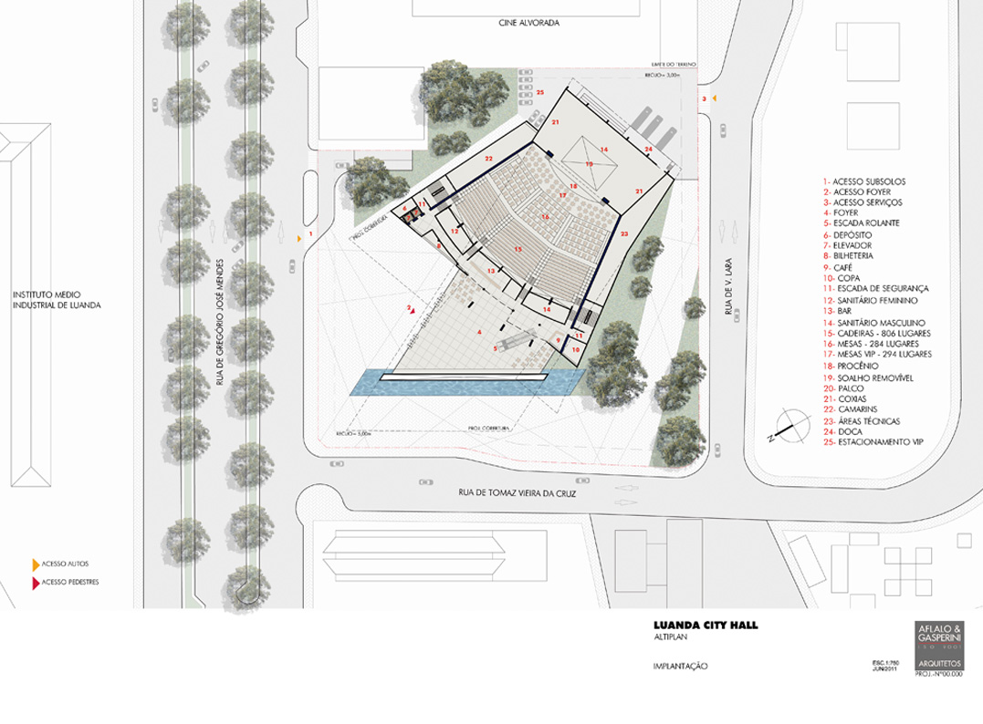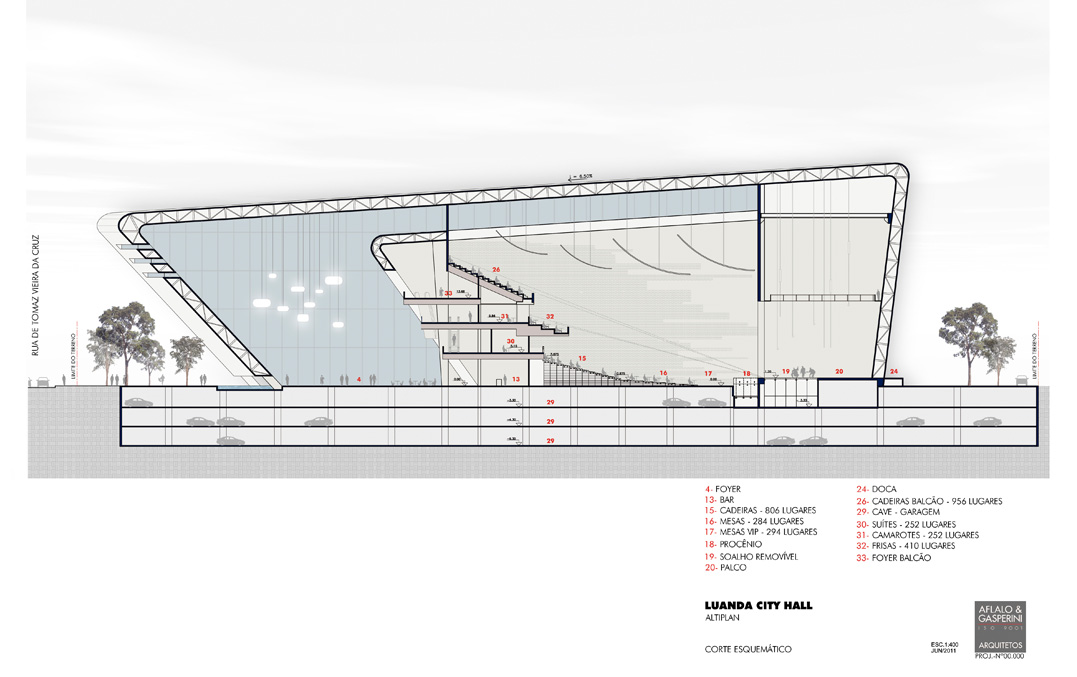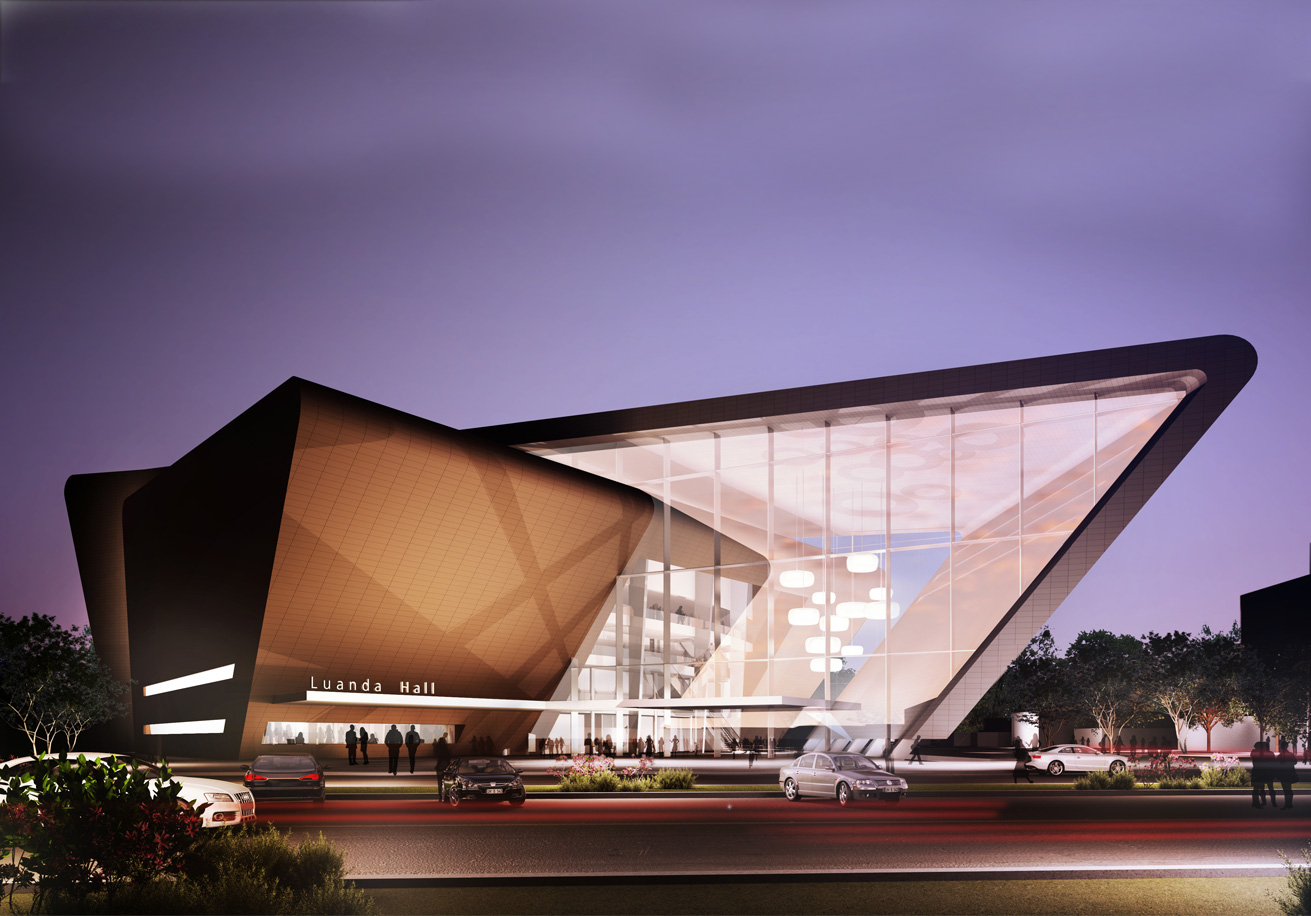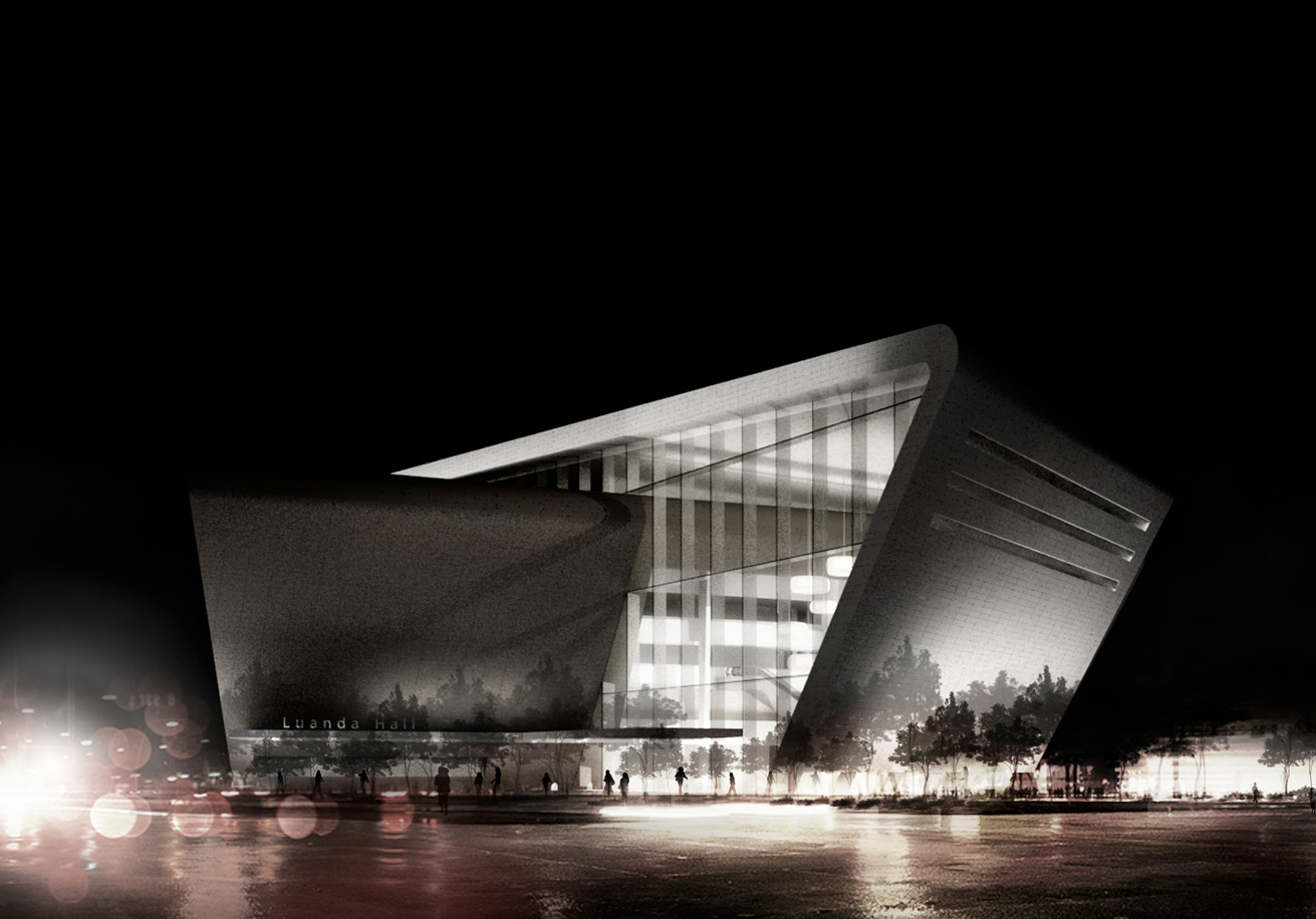 Situada num entroncamento importante da capital angolana, que, na época, ainda contava com muitos vazios em sua região central, este estudo para uma casa de espetáculos foi mais uma incursão do escritório no país africano. A sócia-diretora Grazzieli Gomes, que encabeçou o trabalho, atribui o contato do investidor à realização, anos antes, do Credicard Hall (hoje Vibra São Paulo). Com proporções menos ambiciosas do que o projeto paulistano, o Luanda City Hall não deixa nada a desejar em termos de estrutura para abrigar grandes produções, como as da Broadway. Pé-direito suficiente no palco para içar equipamentos e recursos cenográficos, assoalho removível para acomodar uma orquestra, docas, estacionamento no subsolo e um foyer generoso e transparente, que funciona como continuação da praça externa, constam do programa. Contido nesse volume maior, o bloco opaco, cujo fechamento prevê uma fachada ventilada, acomoda o teatro em si, com uma plateia que chega a 1400 lugares (entre mesas, cadeiras, cadeiras-balcão, frisas e camarotes). Implantação, plantas de todos os pavimentos, cálculos de inclinação e estudo de estrutura fizeram parte da proposta, bastante minuciosa.